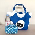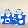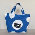 鮮やかな大きめのドッド柄生地にオリジナルのネコのプリント