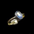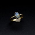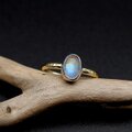光の当たる角度によって、オレンジやブルーの輝き浮かび上がるレインボームーンストーンを純銀で包み、真鍮のアームでシンプルなリングに仕上げました。