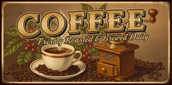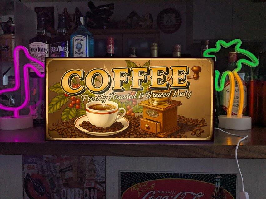 コーヒーとコーヒーグラインダーのアートが描かれた、ベージュとブラウンのトーンの電飾看板。