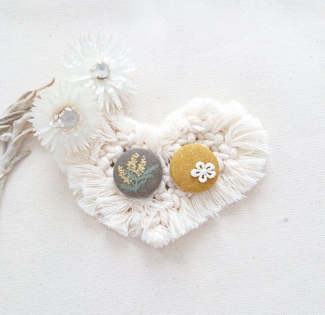 ★くるみボタンブローチ★グレーと黄色の大小ボタンかわいいです。とても綺麗な仕上がりでバッグに付けるのが楽しみです。