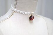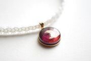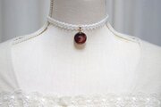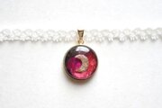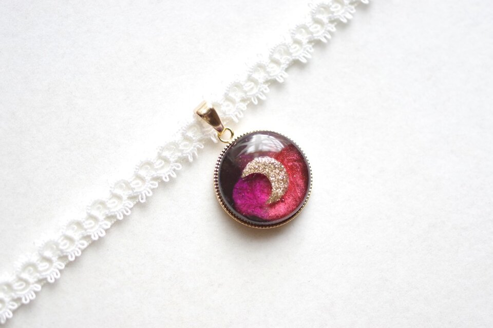 ディープな深紅の背景とゴールドの三日月に魅入ってしまうレジンを、サテンリボンにタティングレースで装飾を施したチョーカーに仕上げました。