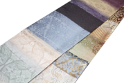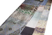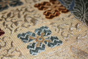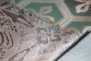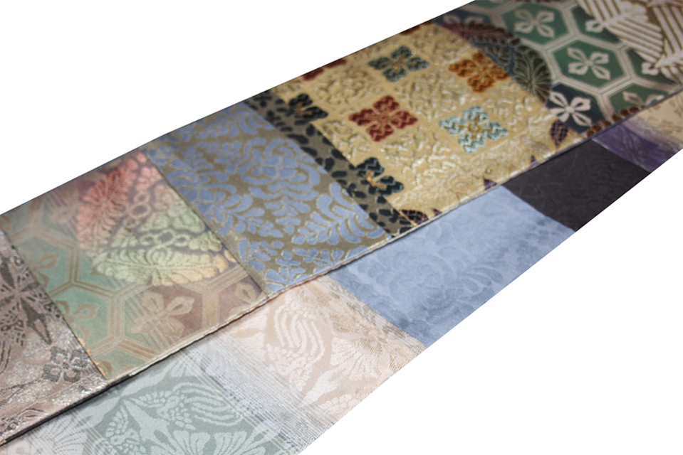 異なる紋様や色合いの織地をパッチワークのように繋ぎ合わせた「切嵌」技法。一つ一つのパーツに伝統的な工芸柄が宿り、見る角度によって様々な表情を見せてくれます。