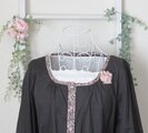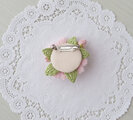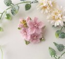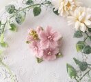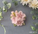 花びらには2種類の刺繍糸でステッチを施しました。小さなパールビーズを縫い留めております。葉には優しい輝きのパールビーズや、小さな花びらを縫い留めました。