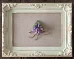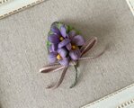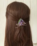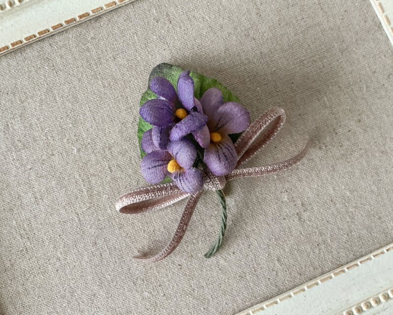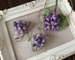 紫色のすみれ3輪に葉とリボンをつけたポニーフック。
