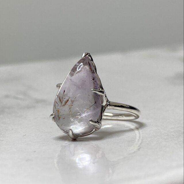 雫型のゲーサイトインアメジストをテクスチャを付けた枠で留めました