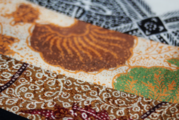 チャンチン(蝋入れの道具)や銅版を用いて、職人が一つひとつ蝋で防染し、何度も染め重ねて生まれる緻密な文様。プリントでは決して表現できない、染料の重なりが生む色の深みが魅力です。