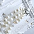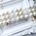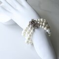 ホワイトカラーのパールとオーロラビーズを複数連に組み上げ、中央に透かし装飾のメタルクラスプを配した、クラシカルで華やかなデザインです。