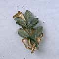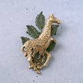 黒ずみ加工が施されたアンティークゴールド、マットなイエローゴールド、グリーンに色付けされた真鍮で、リーフをバックに歩くキリンの親子がデザインされたヴィンテージブローチです。