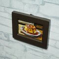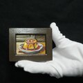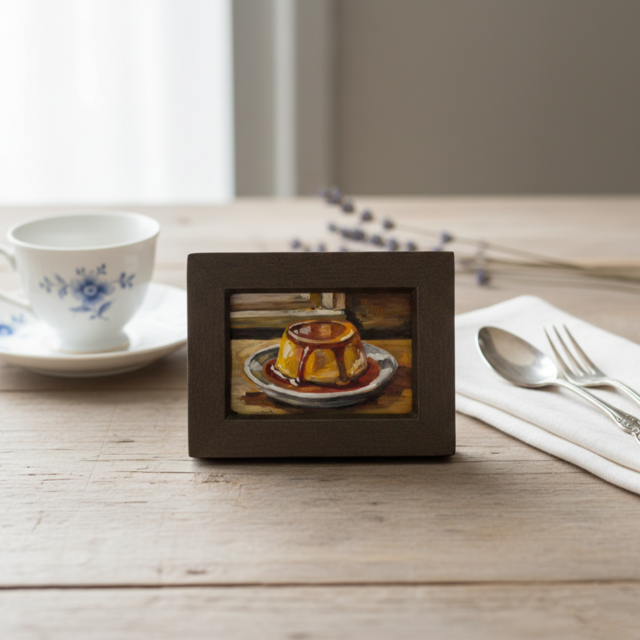 「プリン」は、小さな額縁に閉じ込められた、贅沢なひとときをお届けする特別なミニ絵画です。この作品は、プリンの表面に滴るキャラメルソースの艶やかな表現に始まり、見る人の目を惹きつけ、心を癒やします。油彩ならではの重厚な絵具の重なりは、ソースの粘り気や甘い香りを想像させ、リアルな質感を生み出しています。