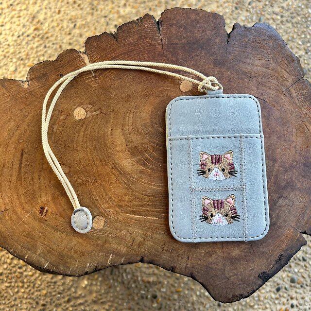 ライトグレーの牛革に茶トラ猫の刺繡を施しパッチワークをして仕立てました。