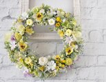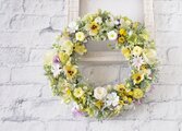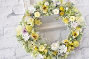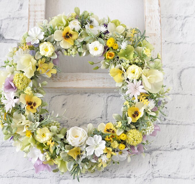 #グリーン #ナチュラル #春 #ライトグリーン #夏 #白 #パンジー #スイトピー #パステルカラー #ウェディング #きいろ #春リース #花リース #アーティフィシャルフラワー #かわいい #明るい色 #黄色 #初夏 #母の日