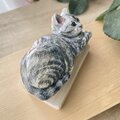 リピートです。今度の作品も大変可愛く、ぬくもりを感じます。木彫りですので軽やかなのも良いですし、毛並みがまるで本物の猫のように見えます! 付けない時は前回購入したブローチとセットで飾ります。 今回もありがとうございました!