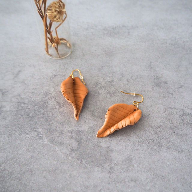 ナチュラルな雰囲気と大人の上品さを兼ね備えた、葉っぱ型デザインのレザーピアス。植物タンニン鞣しの本革を使用し、使い込むほどに色艶が深まり、自分だけの経年変化(エイジング)を楽しめるレザーアクセサリーです。