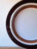 デザインの特徴は、職人の手仕事によって施された深いブラウンのラインです。Rosmarin(ローズマリー)特有の温かみのある茶色の染料を用い、ハンドペイントならではの筆致が感じられる太い帯状のラインと、繊細な細いラインが組み合わされています。