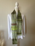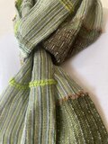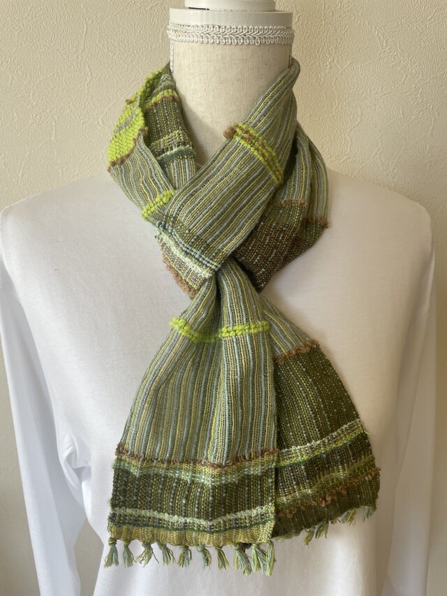 横糸に細い細いリネン糸をベースにして、透明感とシャリ感、軽さを出しつつ、クリームのようなモコモコ糸もチラホラしています。