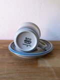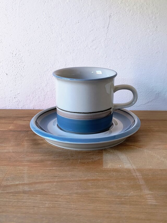 1982年から1999年まで製造された本シリーズは、水辺を連想させる静謐なデザインが特徴です。落ち着いたベージュの地色に、淡いブルー、グレー、そしてブラックの細いラインが水平に描かれており、北欧の穏やかな自然風景を象徴するようなミニマルで洗練された印象を与えます。