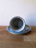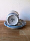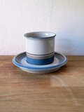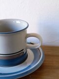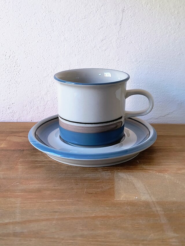 1982年から1999年まで製造された本シリーズは、水辺を連想させる静謐なデザインが特徴です。落ち着いたベージュの地色に、淡いブルー、グレー、そしてブラックの細いラインが水平に描かれており、北欧の穏やかな自然風景を象徴するようなミニマルで洗練された印象を与えます。