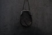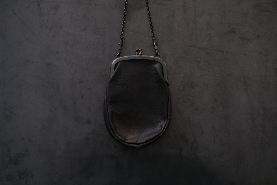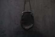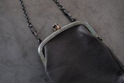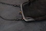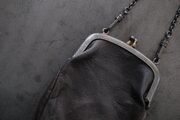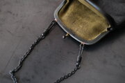 摘み部分が特徴的な口金フレームに、本体はマチが付いています。真鍮ロウ付けのチェーンのショルダー紐が付属します。