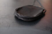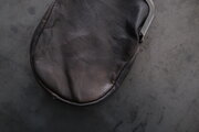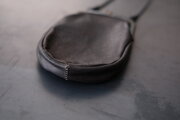 革は、作り手の高見澤さんのものづくりの特徴である、革屋さんからではなく猟師から直接仕入れるジビエ革。徳島県で捕られた鹿の皮を、タンニンで鞣し、染料染めしています。一枚革ですが、外面には黒、裏面にはカーキ色に染められています。鹿革らしい滑らかさと柔らかさがあります。