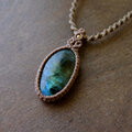 一見暗めの石ですが、見る角度や光の加減で現れる濃く深みのあるブルーグリーン、ゴールドに輝くシラー(ラブラドレッセンス)が魅力的なマダガスカル産ラブラドライトのマクラメ編みペンダントです。