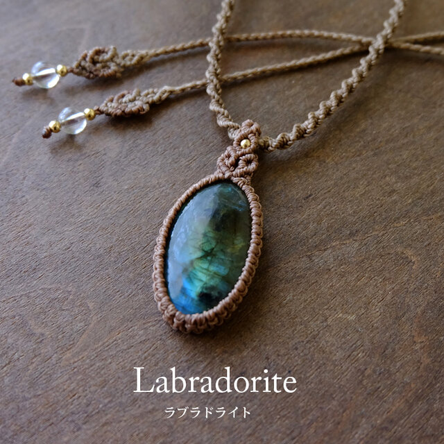 まるで宇宙を思わせる幻想的なラブラドライトが引き立つように落ち着きのあるコードでシンプルに編み込み印象的なマクラメペンダントに仕上げました。