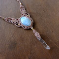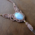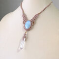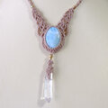 カリブ海の美しい宝石と呼ばれるドミニカ共和国原産ラリマーにやや小ぶりですが透明度の高いブラジル産水晶ポイント原石を合わせた1点ものマクラメ編みペンダントネックレスです。