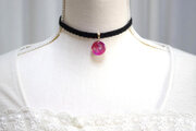 赤、ピンク、紫が混然一体となったレジンにゴールドのラメを散らし、ベルベットリボンにタティングレースで装飾を施したチョーカーに仕上げました。