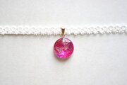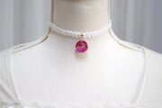 赤、ピンク、紫が混然一体となったレジンにゴールドのラメを散らし、サテンリボンにタティングレースで装飾を施したチョーカーに仕上げました。
