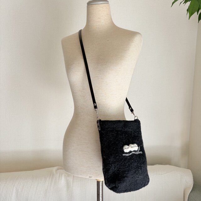 黒系の色合いの手作りフエルトのショルダーバックです。
