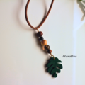 上質のオニキス、スモーキークォーツ、ウッドビーズを合わせ製作したキュートなモンステラのCarミラーハンギングです。