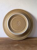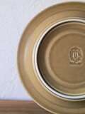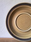 中央から外側に向かって刻まれた繊細なラインが、光を受けることで豊かな陰影を生み出します。深いブラウンの釉薬は、焼き上がりの条件によって一点ごとに濃淡が異なり、釉薬が溜まった部分の艶やかな質感と、エッジ部分の明るい発色のコントラストがヴィンテージ特有の奥深い表情を見せてくれます。