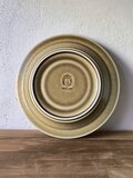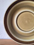 中央から外側に向かって刻まれた繊細なラインが、光を受けることで豊かな陰影を生み出します。深いブラウンの釉薬は、焼き上がりの条件によって一点ごとに濃淡が異なり、釉薬が溜まった部分の艶やかな質感と、エッジ部分の明るい発色のコントラストがヴィンテージ特有の奥深い表情を見せてくれます。