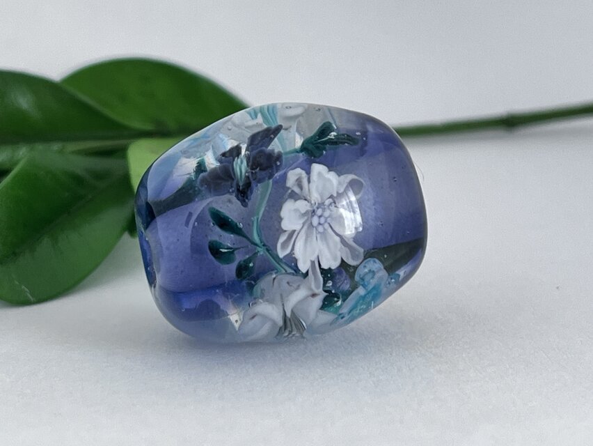 小さいサイズのとんぼ玉ですが、お花と葉をたっぷり入れました