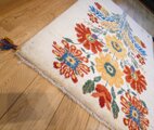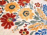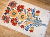 ベースとなるのは、染めていない羊毛本来の美しさを活かした、優しく柔らかなアイボリー。そのキャンバスの上に、今にも香りが漂ってきそうなほど生き生きとした大輪の花々がダイナミックに織り描かれています。