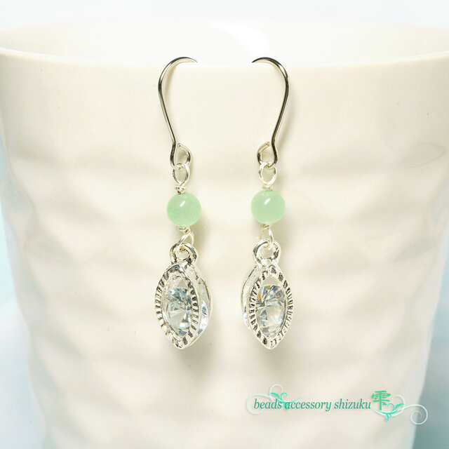 ガラスのカットストーンがはめ込まれた、マーキス型のメタルパーツが揺れるピアスです。