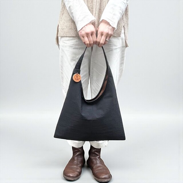 三角形のシンプルなホーボーバッグ。幅広の肩紐に、大きく開けた肩口はスマートに肩にかけることができます。