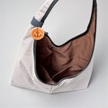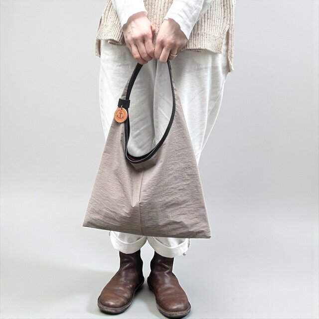 三角形のシンプルなホーボーバッグ。幅広の肩紐に、大きく開けた肩口はスマートに肩にかけることができます。