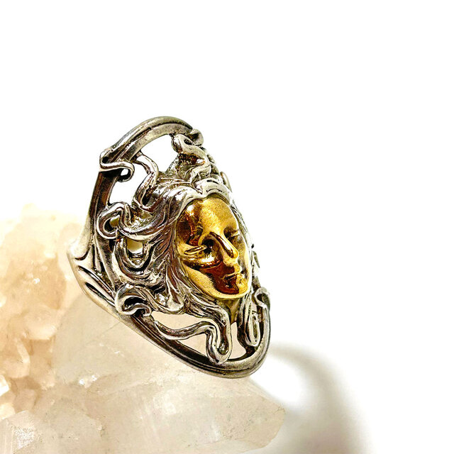 こちらは、スターリングシルバーとK18ゴールドを贅沢に組み合わせたメデューサモチーフのリング。