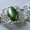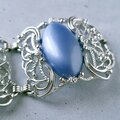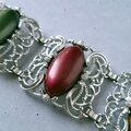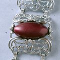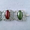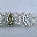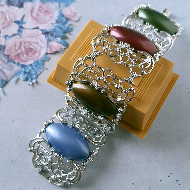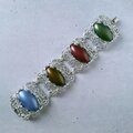 1949年にニューヨークで創業したSarah Coventry(サラコベントリー)の1960年に販売された“Carrousel”のフラワーやスワールが施されたスクエア型の透かしシルバーメタルにブルー、ブラウン、レッド、グリーンのカボションがあしらわれたヴィンテージブレスレットです。