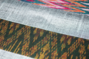 素朴な風合いの紬(つむぎ)をベースに、鮮やかな色彩を放つタイシルクを贅沢に縫い合わせた、世界に一本だけの創作なごや帯です。