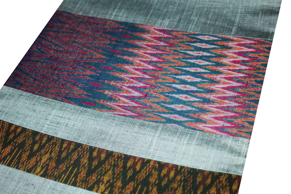 タイシルク特有の、ジグザグとした力強い幾何学模様や細やかなイカット(絣)が、装いの印象的なアクセントとなります。