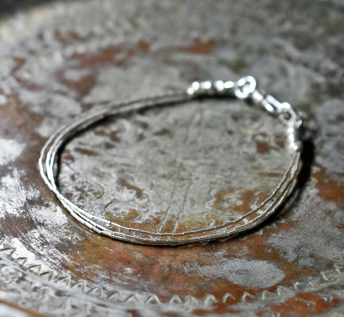 繊細筒型シルバービーズのシンプルな3連のブレスです。