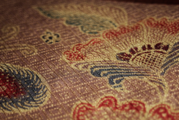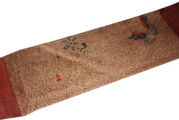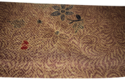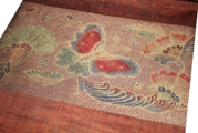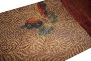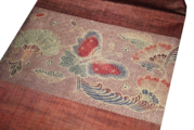 暖かみのあるオレンジやブラウンを基調とした色彩は、シルク特有の光沢と重なり、エキゾチックで高貴な印象を放ちます。