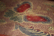 チャンチンを用いた緻密な蝋けつ染めにより、複雑な花紋や幾何学模様が鮮やかに描き出されています。