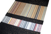 異なる個性の生地を横段状に繋ぎ合わせたデザインは、アート作品のような佇まいです。