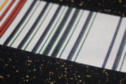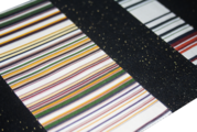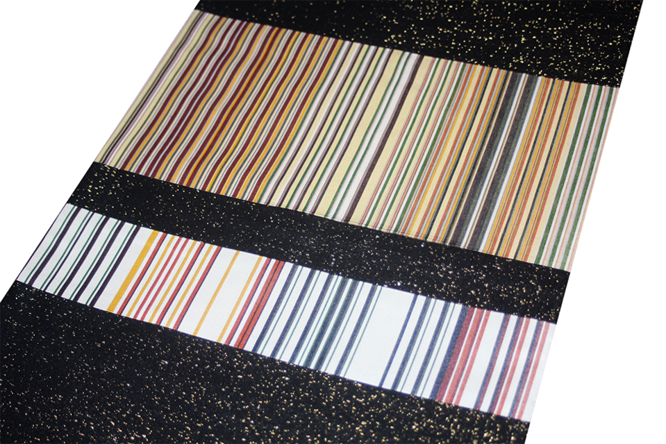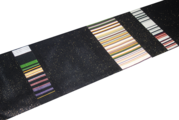 漆黒の夜空に星が散りばめられたような正絹ブラックラメ生地をベースに、鮮やかな縞(しま)模様を大胆に縫い合わせた、グラフィカルでモダンな創作なごや帯です。