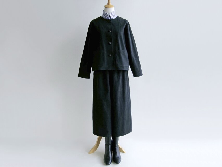 黒の上下ですが、綿麻キャンバス生地の適度なラフさとカジュアル感のおかげでフォーマルになり過ぎず、普段のお出かけ着にピッタリです。タートルネックプルオーバーやブラウスを合わせたり、あるいは上下それぞれを別に使ったり…さまざまなコーディネートで、春先や秋口などの幅広い季節にご着用いただけます。