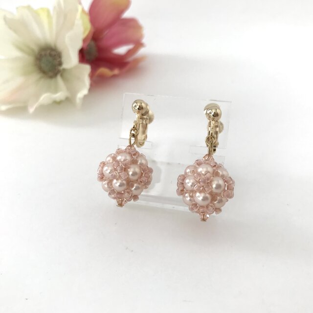 上品な桜色のビーズボールのイヤリングです。