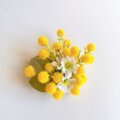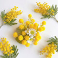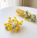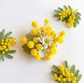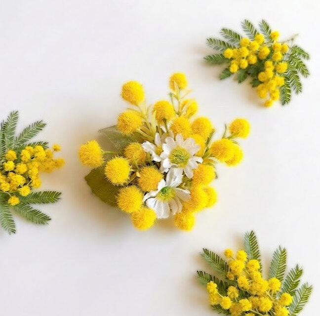 胸元にそっと咲く、春の花ミモザ。