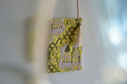 ●ミモザイエローとホワイトが輝くカラーが魅力のモケットスマホポーチ。